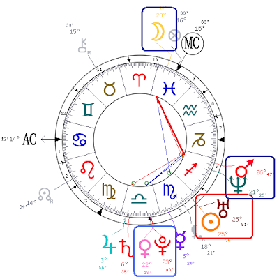 L'aspect donne également une sorte de charisme, Mars est maitre traditionnel du scorpion, donc valorisé, tout comme Neptune, Maitre de la Lune, leur conjonction participe à cet aspect coup de poing du personnage, il s'agit aussi de frapper (Mars) l'imaginaire (Neptune/Lune) et ce pour que ça marche, que ça fonctionne (VI).